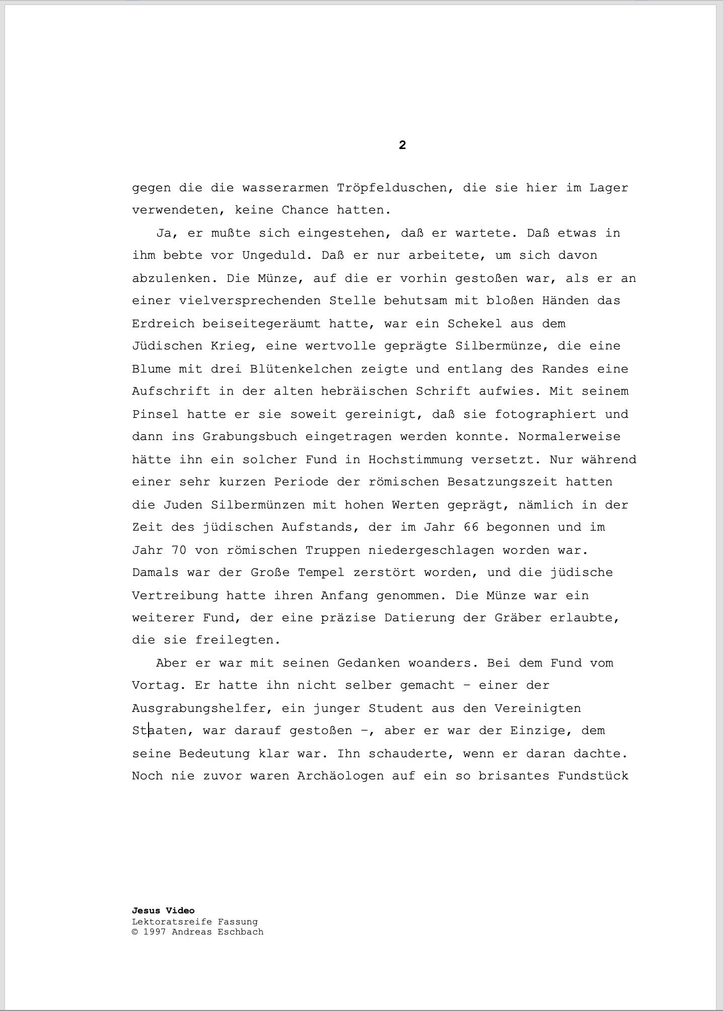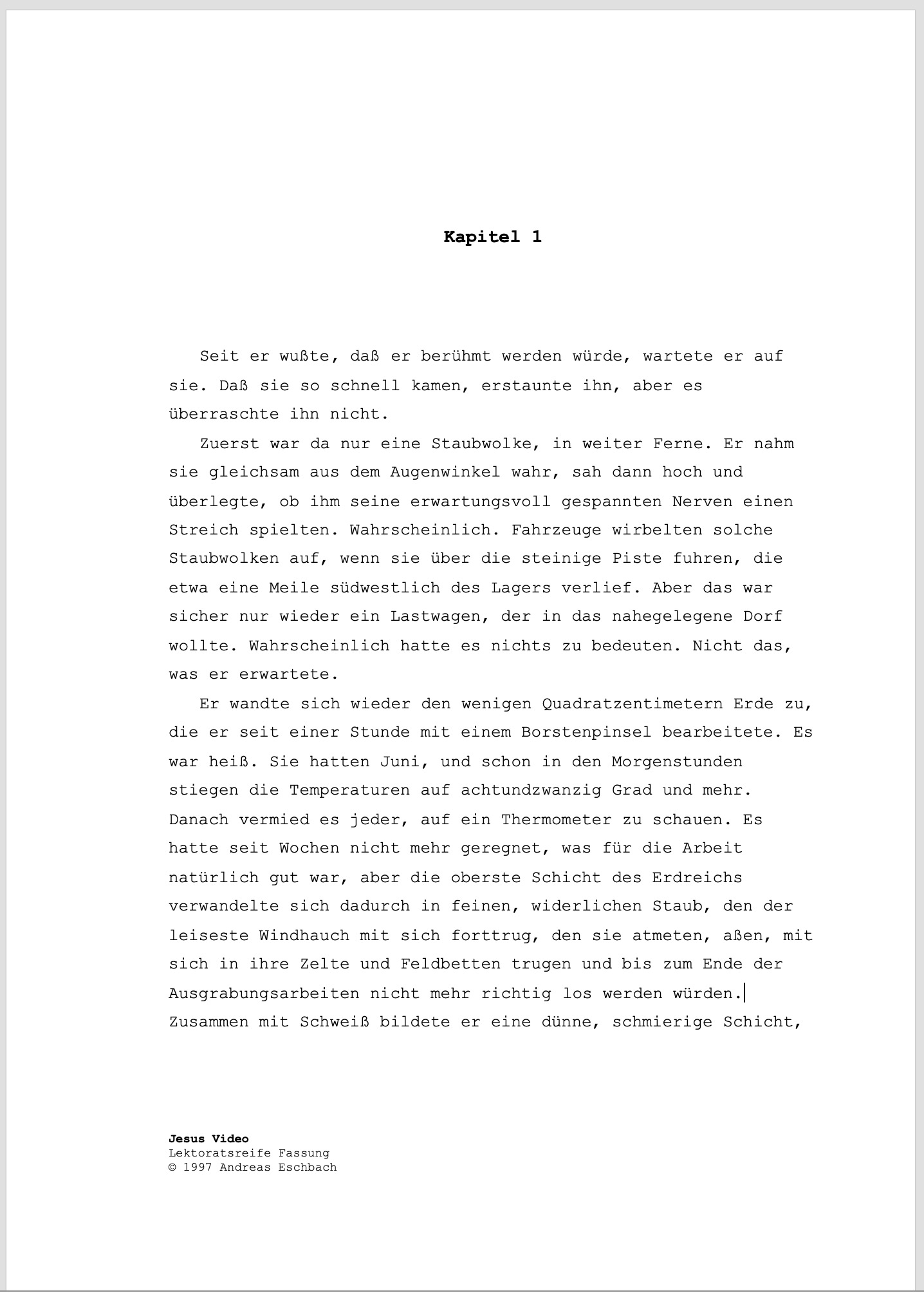 So haben einst die ersten beiden Seiten des Manuskripts meines Romans "Jesus Video" ausgesehen: